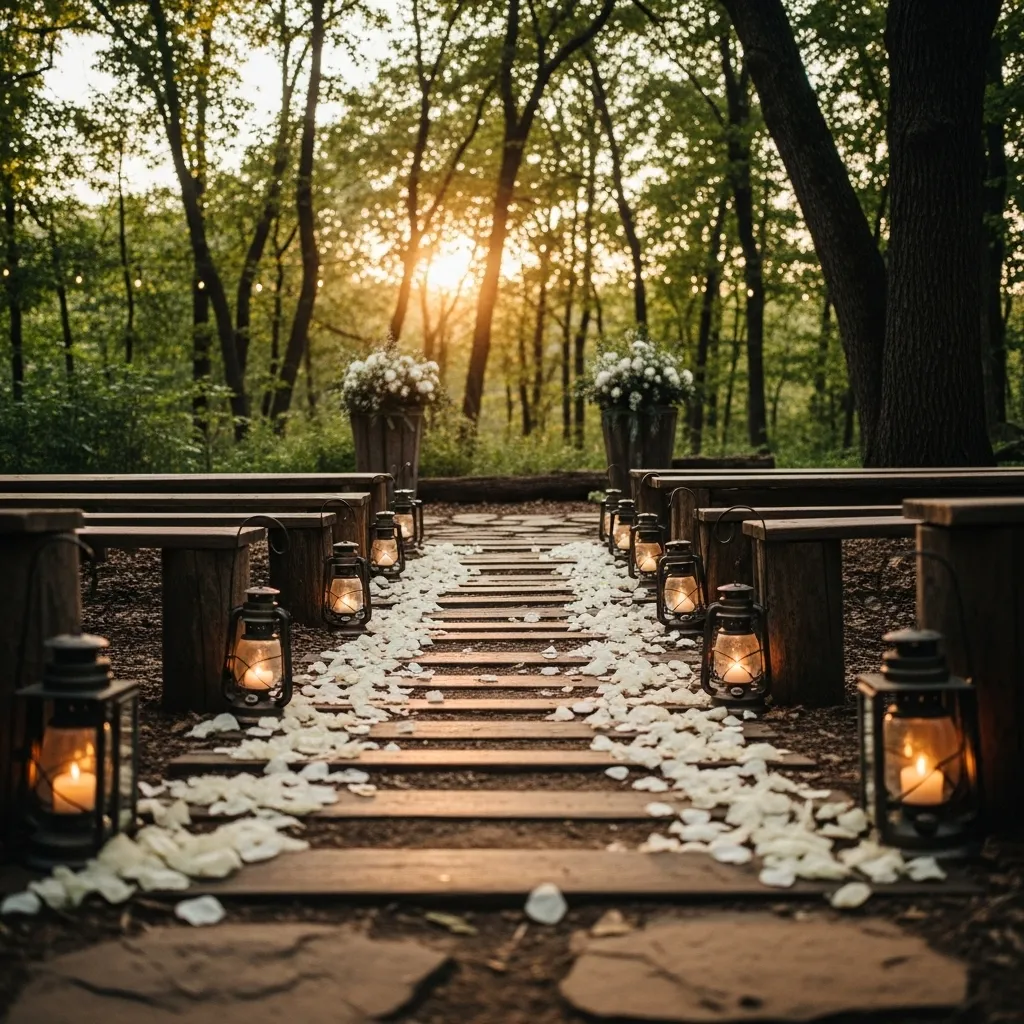 Your wedding aisle is the pathway to “I do,” so make it memorable. Options include flower petals scattered along the walkway, candles in glass holders, or rustic lanterns. You could also drape fabric or greenery along the seating rows for a softer, romantic vibe.