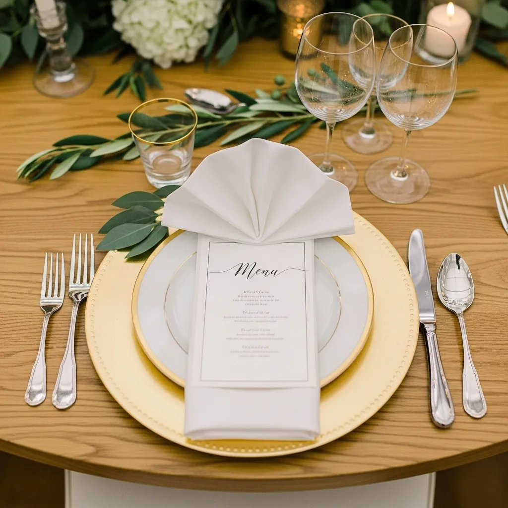 Beyond centerpieces, table décor includes linens, chargers, napkins, and place cards. Even small details like folded napkins tied with ribbon or personalized menus can make your tablescape look polished and cohesive.