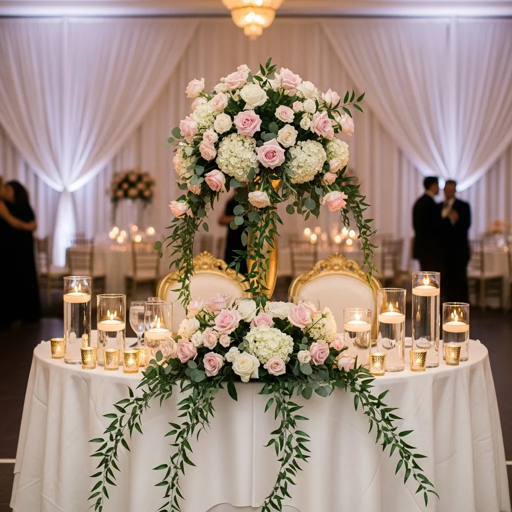 As the couple, your table should stand out. Decorate it with extra florals, candles, or a backdrop that frames the two of you beautifully. This table often becomes the focal point of the reception space, so don’t be afraid to make it feel special.
