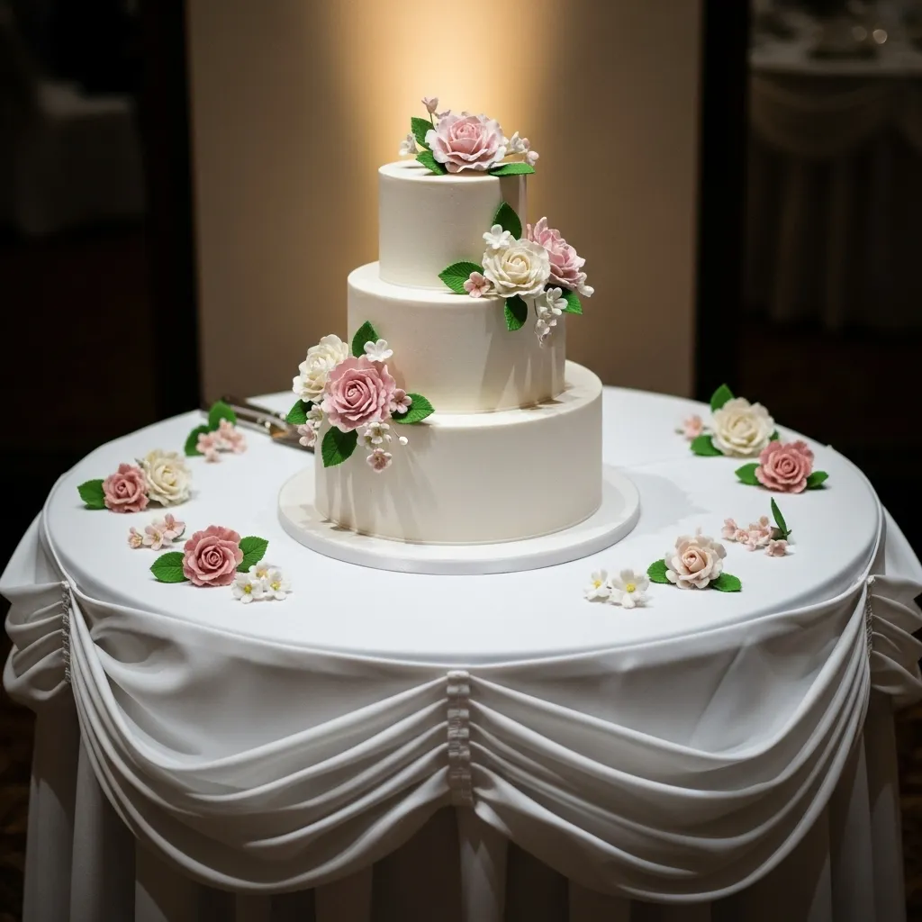 The wedding cake is more than dessert—it’s a décor piece. Create a designated cake table with fabric drapes, florals, or a dramatic backdrop to highlight the centerpiece.
