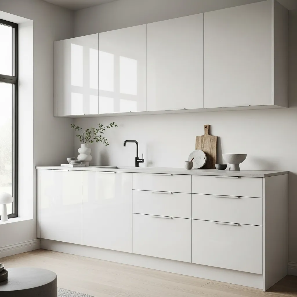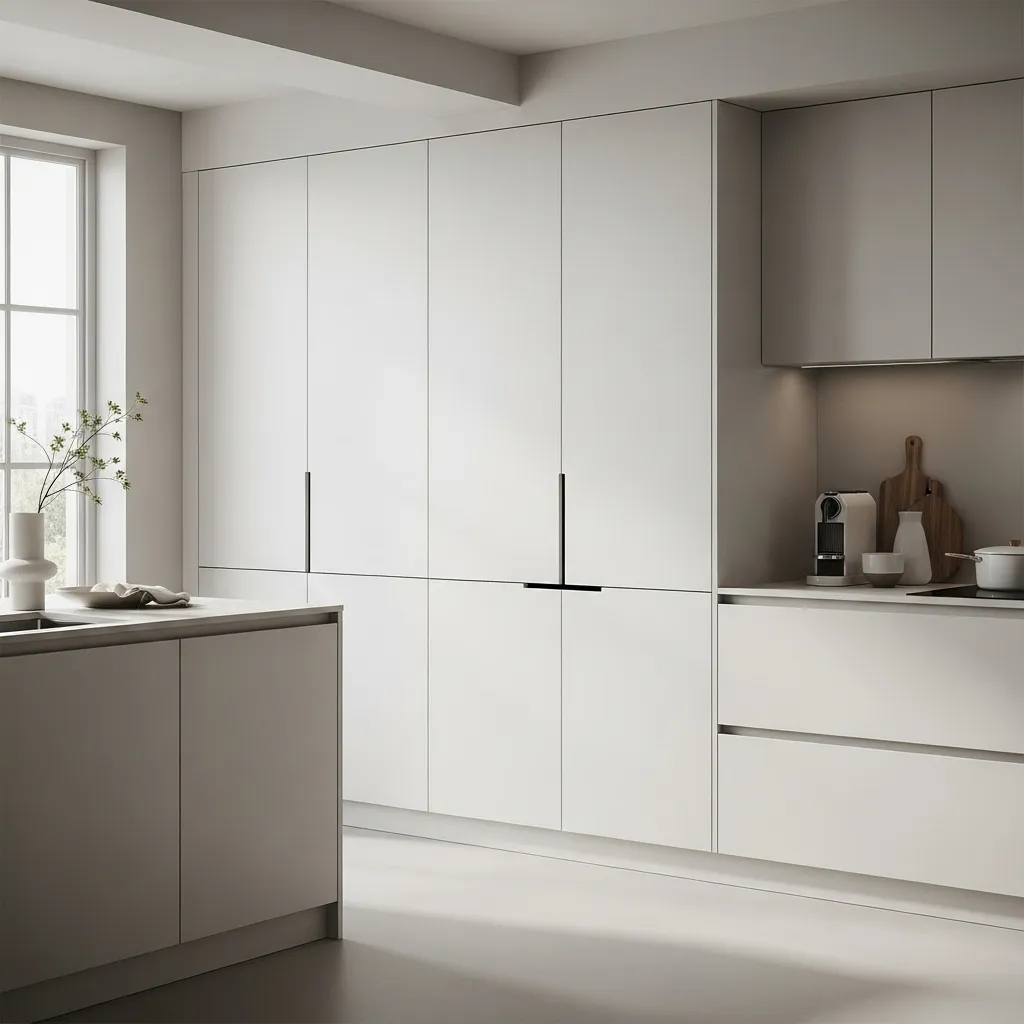 For a true modern minimalist design, choose white cabinets with hidden or integrated handles. This creates a smooth, streamlined appearance with no visible hardware interrupting the flow.