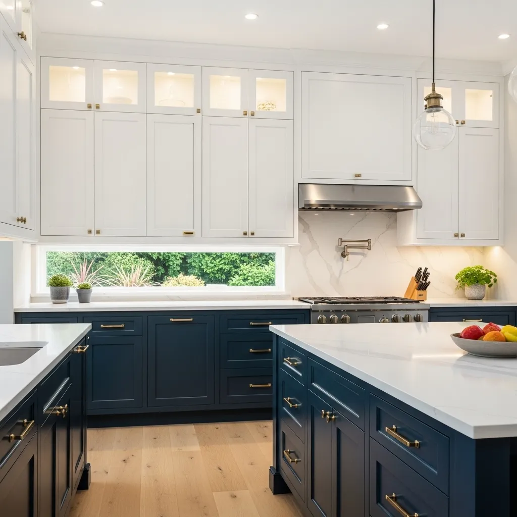 Two-tone cabinets are a popular trend that brings depth and contrast to your kitchen. A common approach is using white cabinets on top and a bold color—like navy, sage green, or charcoal—on the bottom. This combination keeps the kitchen feeling bright while adding stylish character to the lower cabinets.