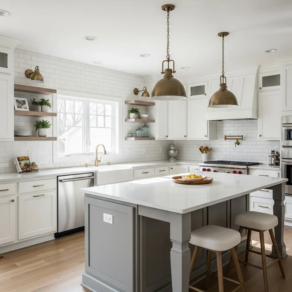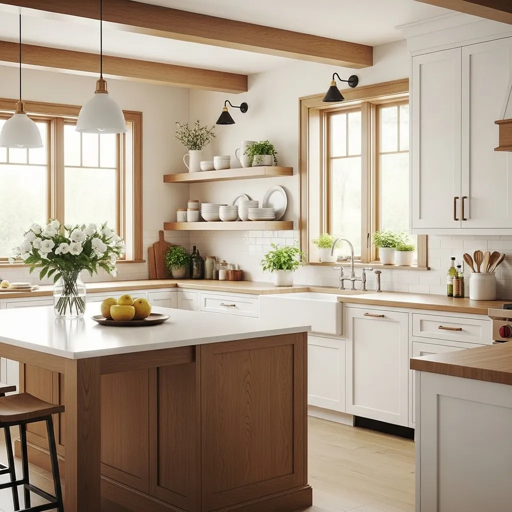 White cabinets paired with warm wood elements create a cozy yet modern look. You can incorporate wood through open shelving, wooden handles, a butcher-block island, or wooden trim. The natural tones soften the white and bring an inviting warmth to the kitchen.