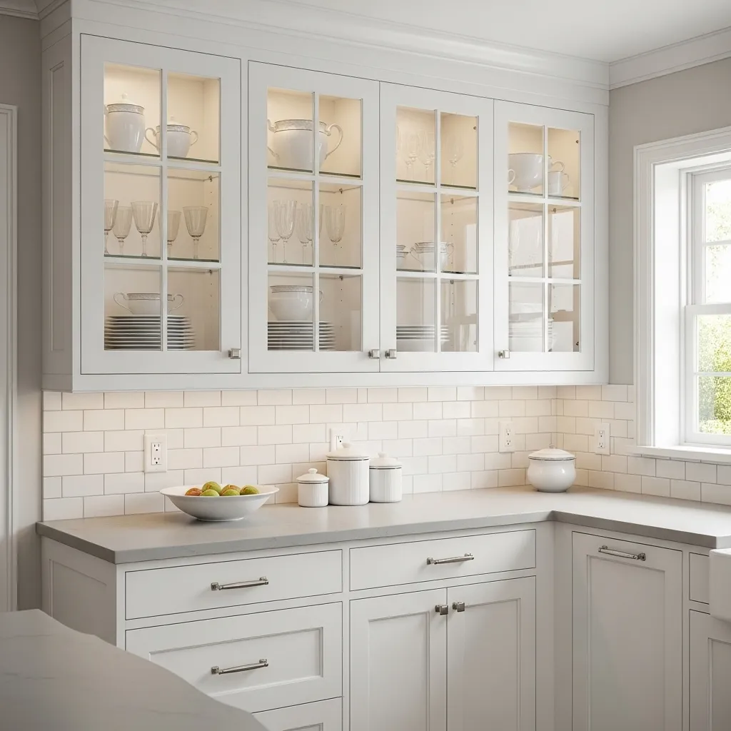 Glass-front upper cabinets give your kitchen a light and airy feel while adding a touch of elegance. They’re perfect for displaying dishware, glassware, or decorative pieces. The transparency breaks up the solid white, creating visual variety.