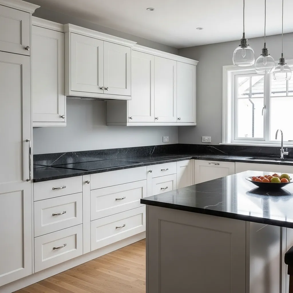 Pairing white cabinets with dark countertops—like black granite, charcoal quartz, or deep brown stone—creates bold contrast. This look adds depth and drama while still maintaining a crisp, modern vibe.
