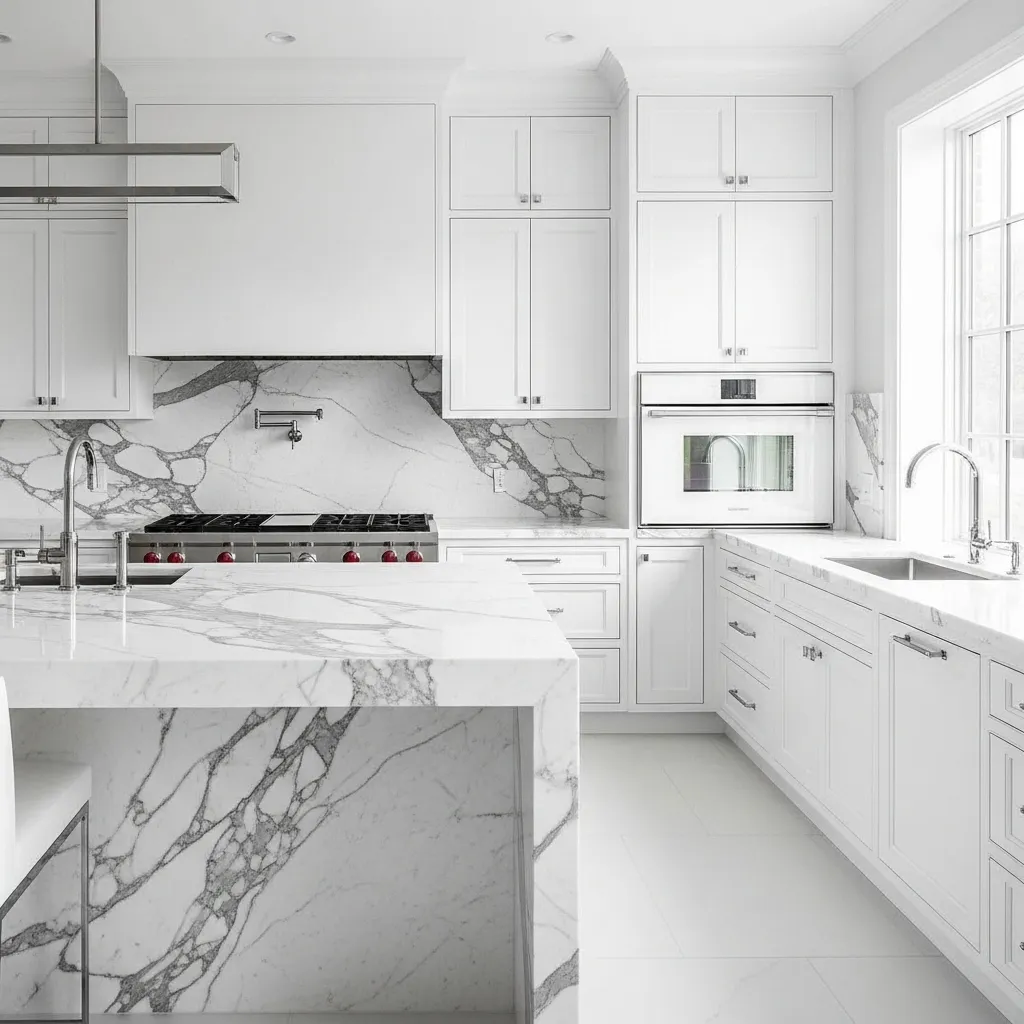 For a sophisticated, high-end kitchen, combine white cabinets with marble countertops or a marble backsplash. The natural veining of marble adds texture and elegance while keeping the look cohesive and bright.