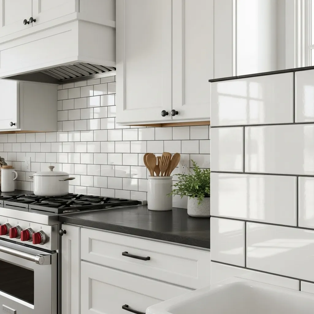 A white subway tile backsplash is a classic choice that pairs beautifully with white cabinets. It adds subtle texture and visual interest without taking over the space. Glossy subway tiles can also help bounce light around the room, making it feel even brighter.